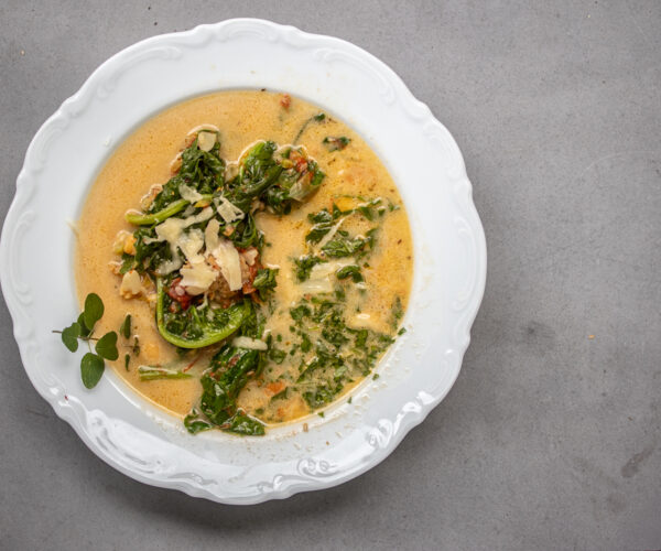 Kichererbsen-Parmesan Suppe mit getrockneten Tomaten, Mangold und Salsiccia