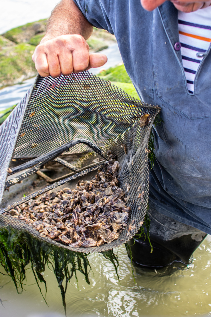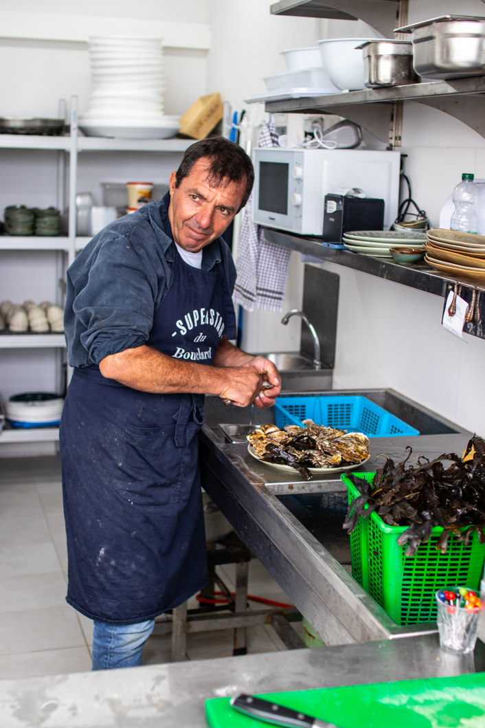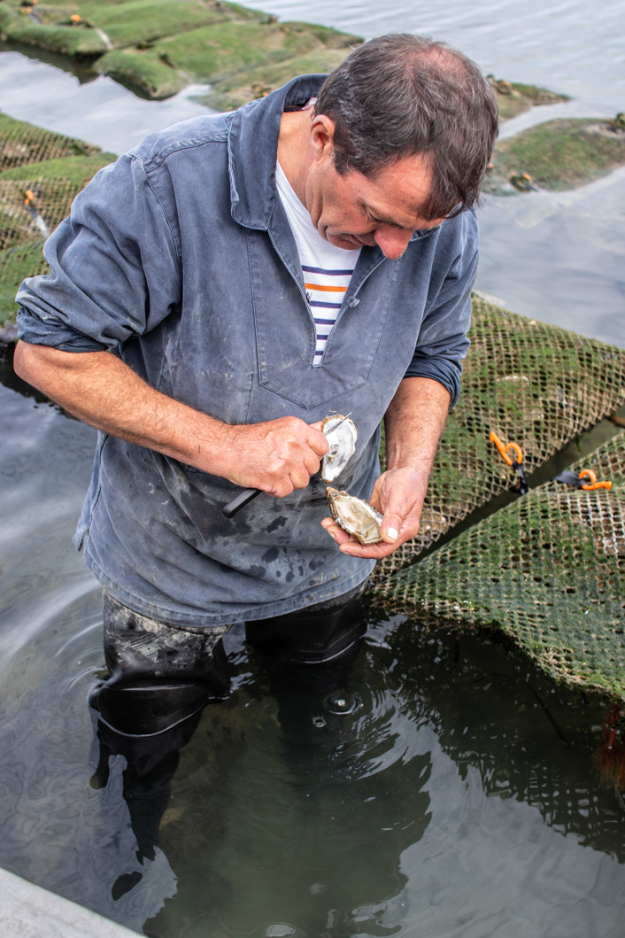 Doch zurück zum Anfang. Meine Reise ins Vendée hat mich hierher auf die bezaubernde Insel Noirmoutier geführt, wo ich den Austernfarmer Alain Gendron in seinem Restaurant besuche. Der steht in der Küche und öffnet eine Auster nach der anderen. Hat er vermutlich schon eine Million Mal getan, denn einen Handschuh braucht er dazu nicht.
