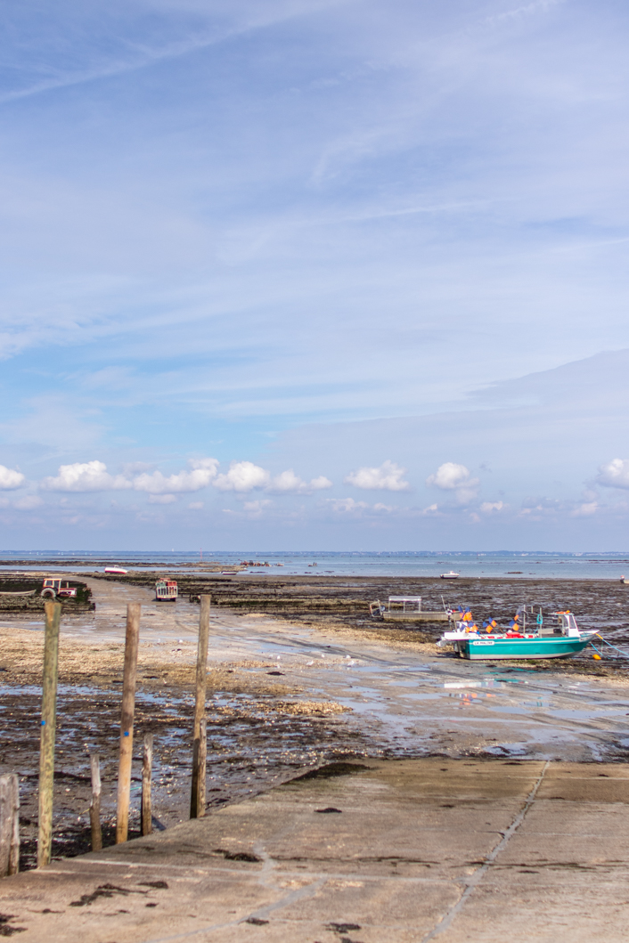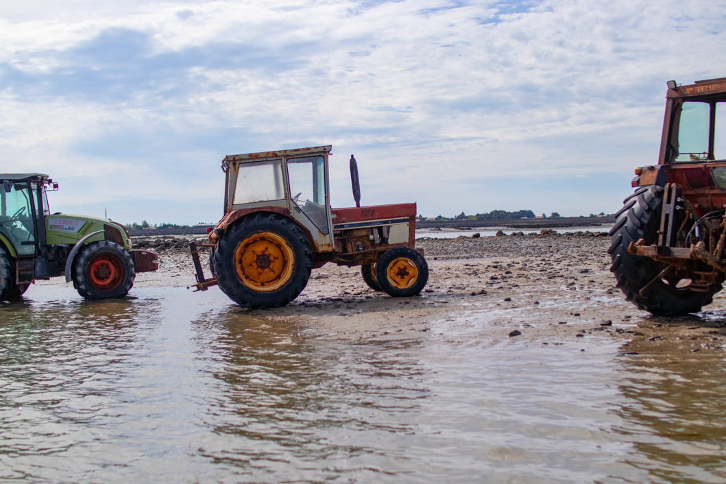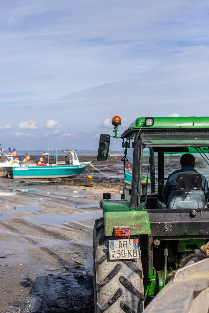 Die Gruppe, das sind 11 koch- und genussbegeisterte Franzosen, die sich alle über eine Plattform kennen, wo man abwechselnd die anderen zum Dinner einlädt. Früher haben sie sich einmal im Monat getroffen, doch im Laufe der Zeit – die Gruppe gibt es in wechselnder Besetzung seit 15 Jahren – wurde daraus eine jährliche gemeinsame, kulinarische Reise. Zwei davon haben sich so kennengelernt und geheiratet. Es gibt also auch Grund zu feiern. Und damit dieser Ausflug zu den Austern perfekt wird, haben sie vorgesorgt und Wein, Käse, Schinken und Baguette eingekauft. Zuerst fühle ich ein bisschen wie das fünfte Rad am Wagen, die kennen sich alle seit Jahren und jetzt stehe ich da mittendrin. Und außerdem bin ich grad schwer damit beschäftigt, mich festzuhalten, damit ich nicht von diesem Boot falle. Es geht also erstmal über die Landstraße – wir stauen den Verkehr ein bisschen, denn so ein Traktor ist ja nicht der Schnellste – und weiter auf eine „Straße“ im Watt. Möglich ist so eine Tour nur bei Ebbe. Bis dahin, wo das Wasser beginnt, fahren wir mit dem Traktor. Dann werden wir langsam ins Wasser gelassen. Alain steigt aus und zieht das Boot in tiefere Gewässer. Der erste Teil wäre also geschafft. Ich bin auf dem Meer. Unbeschadet. Und schon drückt mir einer der Mitfahrer einen Becher in die Hand. Wein? Unbedingt. Schmeckt super hier in der salzigen Meeresluft. Ich fühle mich gleich viel besser.