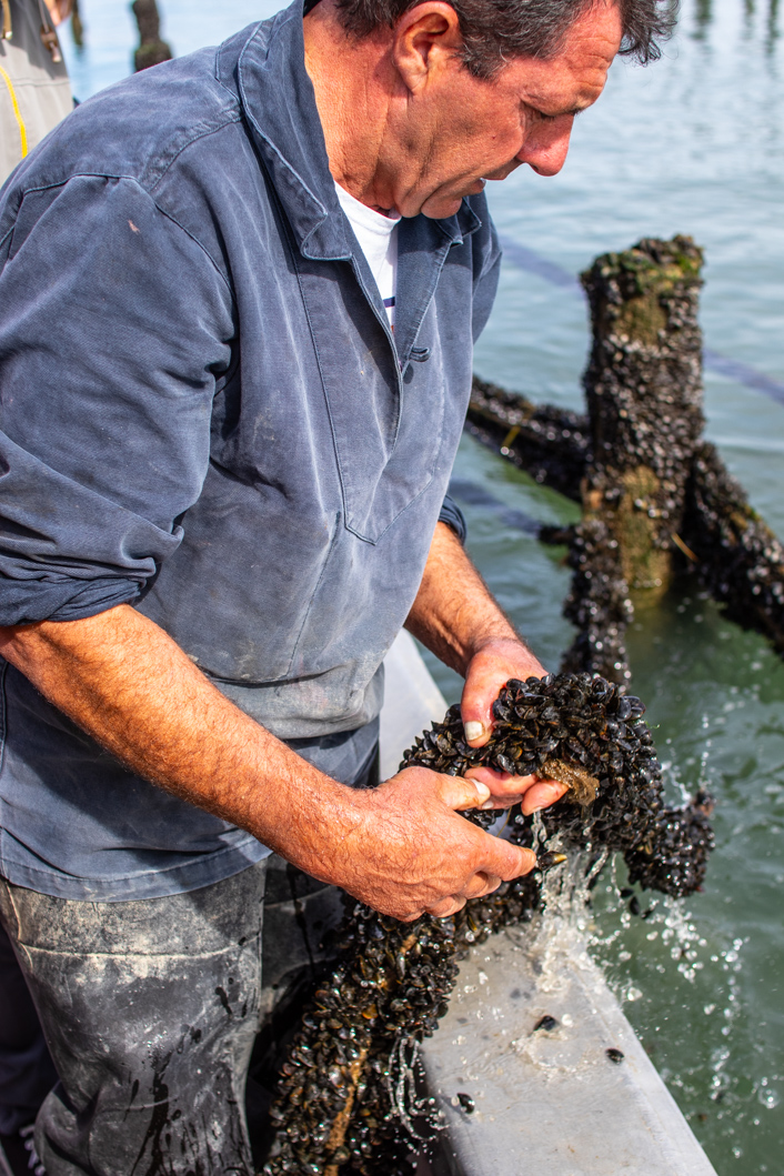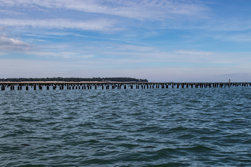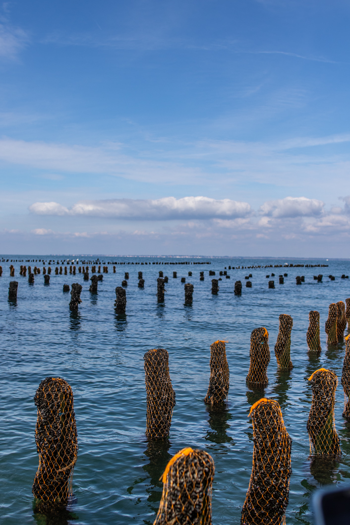 Zuerst schippern wir zu den Muschelbänken. Millionen von Muscheln werden hier gezüchtet. Sie werden an langen Strängen angesiedelt, wo sie wachsen dürfen. Erfreulicherweise klappt das mit dem Muschelzüchten in dieser Region besonders gut. „Von uns bekommt die Bretagne die Baby-Muscheln“, erklärt Alain, denn dort würden sie sich nicht vermehren. Geboren werden sie hier und ein Teil von ihnen, reist dann Richtung Ärmelkanal.