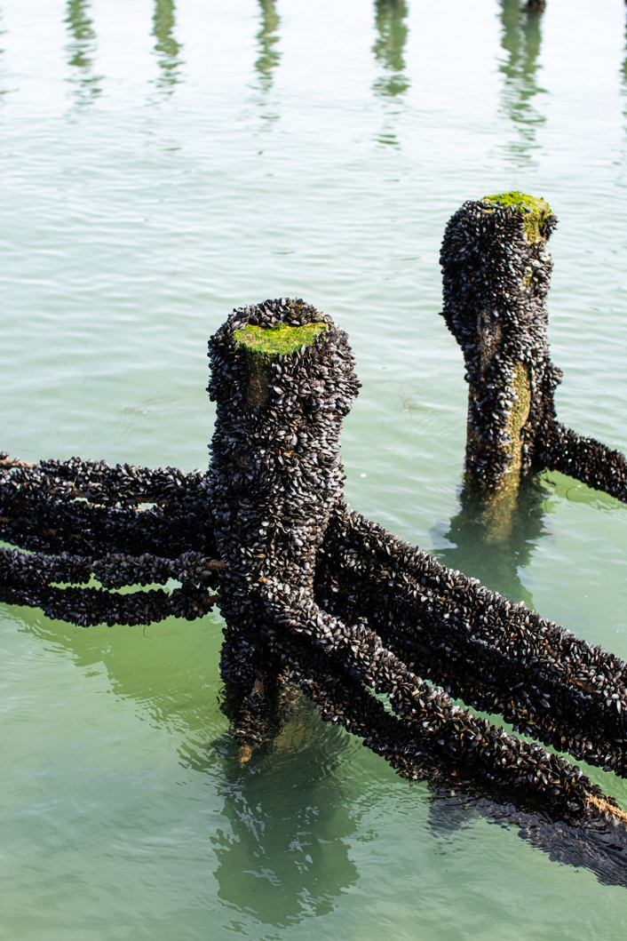 Die schiere Menge an Muscheln ist überwältigend. Da sind die ganz kleinen, die sich an den Pfählen, den „Bouchots“, ansiedeln und dort 2 – 4 Jahre wachsen. Doch nicht nur an den Pfählen, sondern auch an dicken Schnüren wachsen sie. So sind sie besonders gut zu ernten.