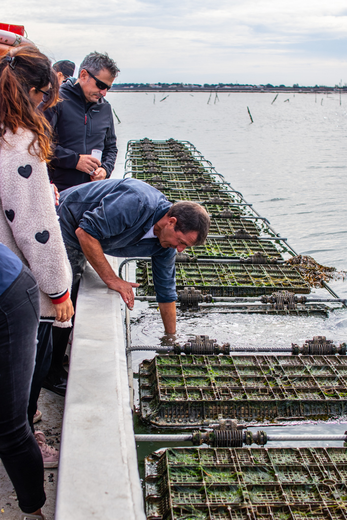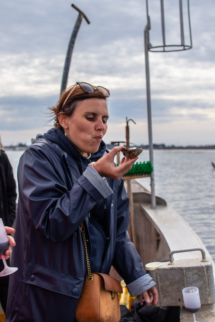 Und da liegen sie. Eingepackt in Netztaschen. In allen Größen. Von der Baby-Auster bis zur stattlichen Größe No. 5. Es gibt hier rund um die Insel nicht nur „die eine Auster“, sondern verschiedene Sorten: „Fines“, „Fines de claire“ und „Spéciales“. Alain steigt vom Boot und steht hüfthoch im Wasser. Er öffnet verschiedene Beutel, damit wir die Wachstumsstadien der Austern begutachten können. Und dann zückt er sein Austernmesser. Er sammelt ein paar der großen Austern ein und öffnet sie für uns (zu diesem Zwecke wurden extra Zitronen und Essig mitgebracht). Ich habe keine andere Wahl – ich, die jetzt nun nicht zu den größten Austernfans zählt, muss da durch. Schließlich ist das Essen einer Auster, die gerade aus dem Meer kommt, Teil des Abenteuers. Während fast alle um mich herum die wohlschmeckende Auster preisen, bin ich ganz fix mit dem Wein, um alles runterzuspülen. Ja, an mich ist diese exklusive Pracht echt verschwendet.