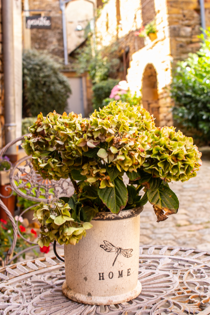 Entzückende kleine Dörfer sind wie ein Magnet. Häuser aus goldenem Kalkstein, enge Gassen, die sich verschlungen durch das Dorf ziehen, Blumen an den Fensterbänken. Es ist still – kaum Besucher, ein paar sitzen vor einer kleinen Bar und genießen ein kühles Bier im Schatten. Leider sind auch fast alle Geschäfte und Kunstwerkstätten geschlossen. Fast alle, bis auf eines. Um den kleinen Laden zu finden, muss man bis an die Spitze des Dorfes laufen, von wo aus man einen überragenden Blick über die Landschaft hat. Ich würde gerne die Drohne über das Dorf fliegen lassen, doch, weil es in der Nähe einen kleinen Sportflughafen gibt, herrscht hier striktes Flugverbot für Drohnen. In dem kleinen Laden gibt es jede Menge Porzellan. Altes Porzellan. Ich entdecke eine Suppenschüssel von Limoges, handbemalt mit kleinen Zitrusfrüchten und goldenen Griffen. Der allerschönste Staubfänger und ich muss ihn natürlich haben. Wird schon irgendwie ins Handgepäck passen.
