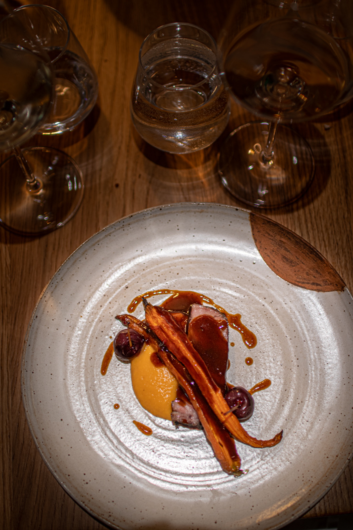 Zum Hauptgang entscheide ich mich für das schwarze Schwein mit Kirschen. Das Fleisch ist großartig aber noch beeindruckender sind die gerösteten Möhren und die Süßkartoffelcreme dazu. Deren Aromen explodieren geradezu im Mund.