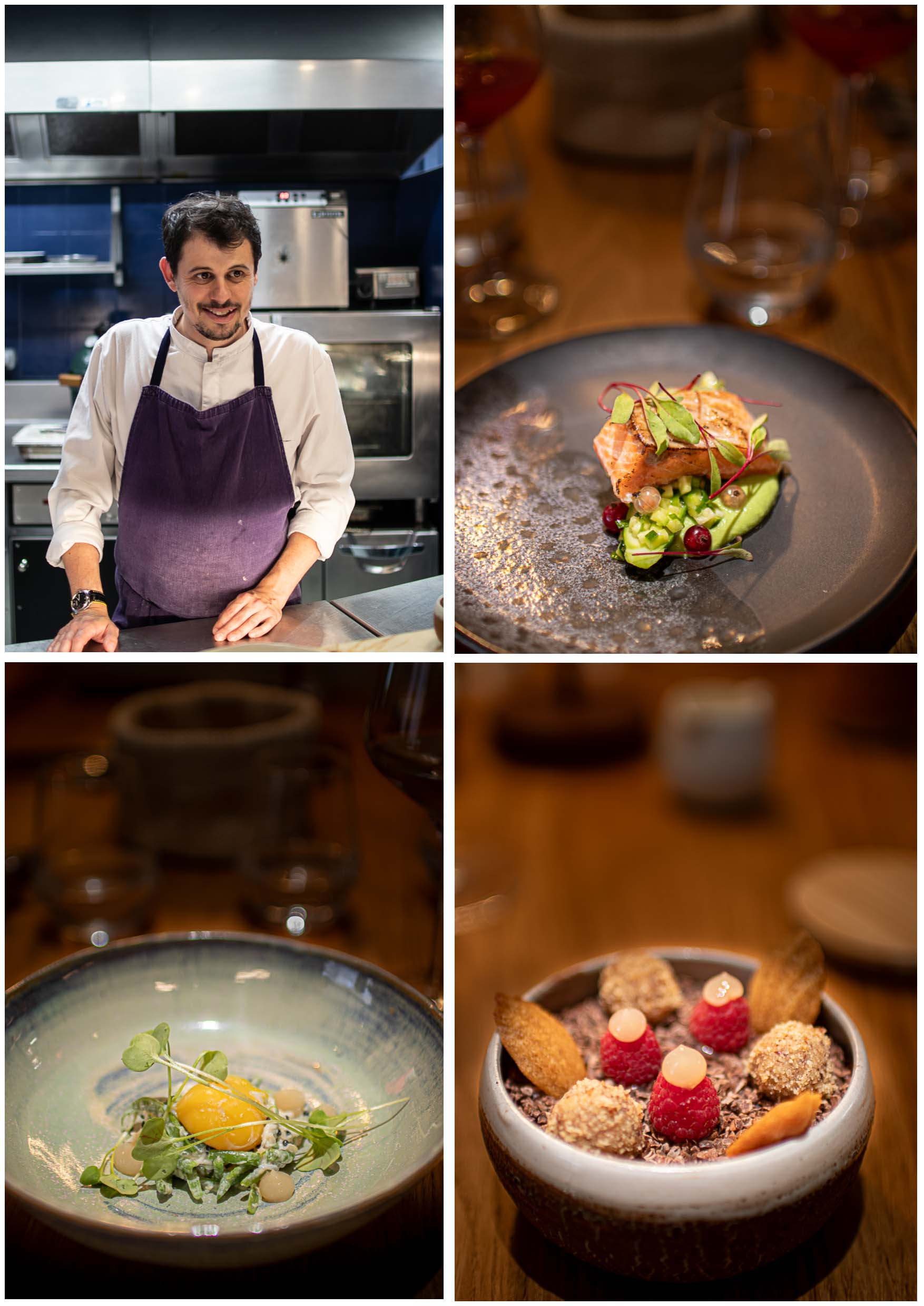Zum Auftakt – ein Extra zum Menü – gibt es einen leicht alkoholischen Cocktail mit Rosen und Wodka. Der erste Gang: Zucchini-Tempura mit einer Creme aus schwarzem Knoblauch, dazu Brioche mit Bresse-Butter und Kürbiskernen. Sehr fein und besonders die unterschiedlichen Texturen gefallen mir gut. Es folgt ein Stück sanft gegarte Forelle mit einer Zucchini-Brunoise und Johannisbeere. Elegant und frisch. Besonders begeistert mich das bei Niedrigtemperatur gegarte Eigelb mit Eiern von der Seespinne mit Zitronengelée.