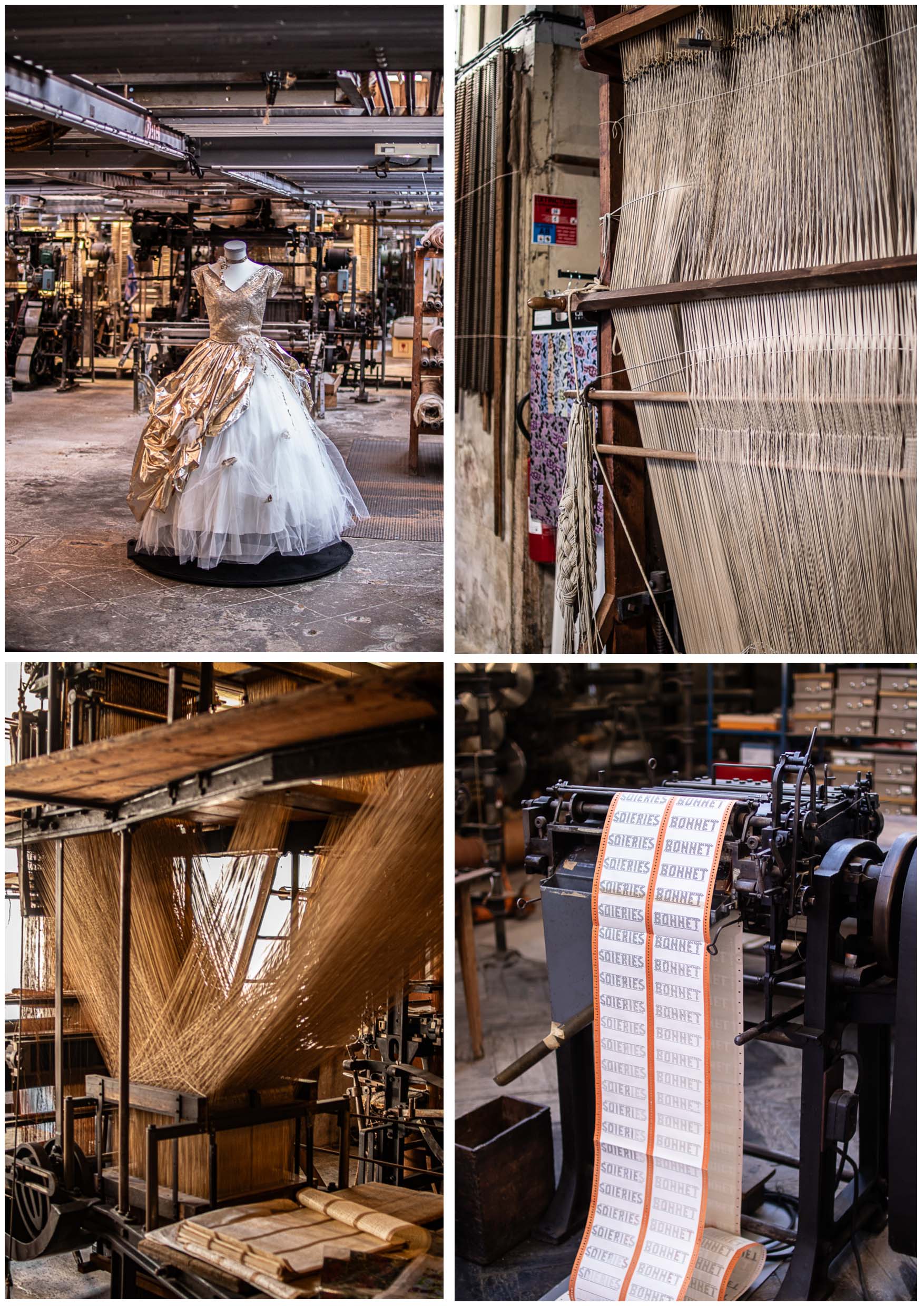 Dann geht es noch einmal durch die hügelige Landschaft, vorbei an kleinen Seen und Wiesen nach Cerdon im Vallée d’Ain. Ain ist das erste Département und war immer Grenzgebiet: zwischen Frankreich, Savoyen und der Schweiz. Das hat die Kultur geprägt – französisch, savoyardisch und jurassisch zugleich. Hier kann man heute einen der einst größten Seide verarbeitenden Betriebe besuchen. Die Hochphase der Seidenherstellung ist längst vorbei, doch die Kreationen, welche für die Couture-Häuser in Paris wie Dior, Chanel und Yves Saint-Laurent u.v.a. entwickelt wurden, sind auch heute noch zu bestaunen. Riesige Webstühle, die von einer Zeit erzählen, wo man noch keine Billig-Fasern aus Kunststoffen kannte. Auf der einen Seite des Fabrikgeländes befindet sich ein kleines Museum und auf der anderen Seite die alte Produktion der Stoffe. An meinem Besuchstag wuseln immer wieder junge Frauen in prachtvollen Hochzeitskleidern zwischen den alten Maschinen hin und her. Später am Tag ist noch eine Hochzeits-Modenschau geplant.