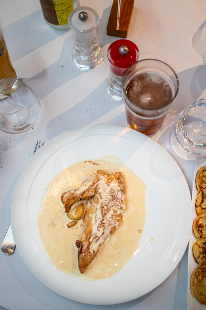 Und dann endlich landet es auf meinem Teller – das berühmte Poulet de Bresse. Jenes Huhn, für das Feinschmecker gerne das fünffache eines normalen Huhns bezahlen (75€ für ein 2 kg Huhn). Es ist der Stolz Frankreichs. Blaue Füße, weißes Federkleid und ein roter Kamm – die Nationalfarben. Dieses Gourmethuhn genießt den streng geschützten Status der Appellation d’Origine Contrôlée (AOC). Es steht für Freilandhaltung, regionale Futtermittel und einer anschließenden besonderen Diät aus Maismehl, Milch und Wasser, was zu einer besonderen Zartheit und Festigkeit des Fleisches führt. Klassisch serviert wird es mit einer Sahnesauce mit Morcheln oder Trüffeln – oder nur mit einer Crème fraîche Sauce, wie in meinem Fall. Die Zartheit des Fleisches ist wirklich überragend. Im Restaurant Place Bernard, einer klassischen Brasserie, serviert man das Huhn außerdem mit kleinen Pfannkuchen. Es ist ein Erlebnis, das man nicht so schnell vergisst.