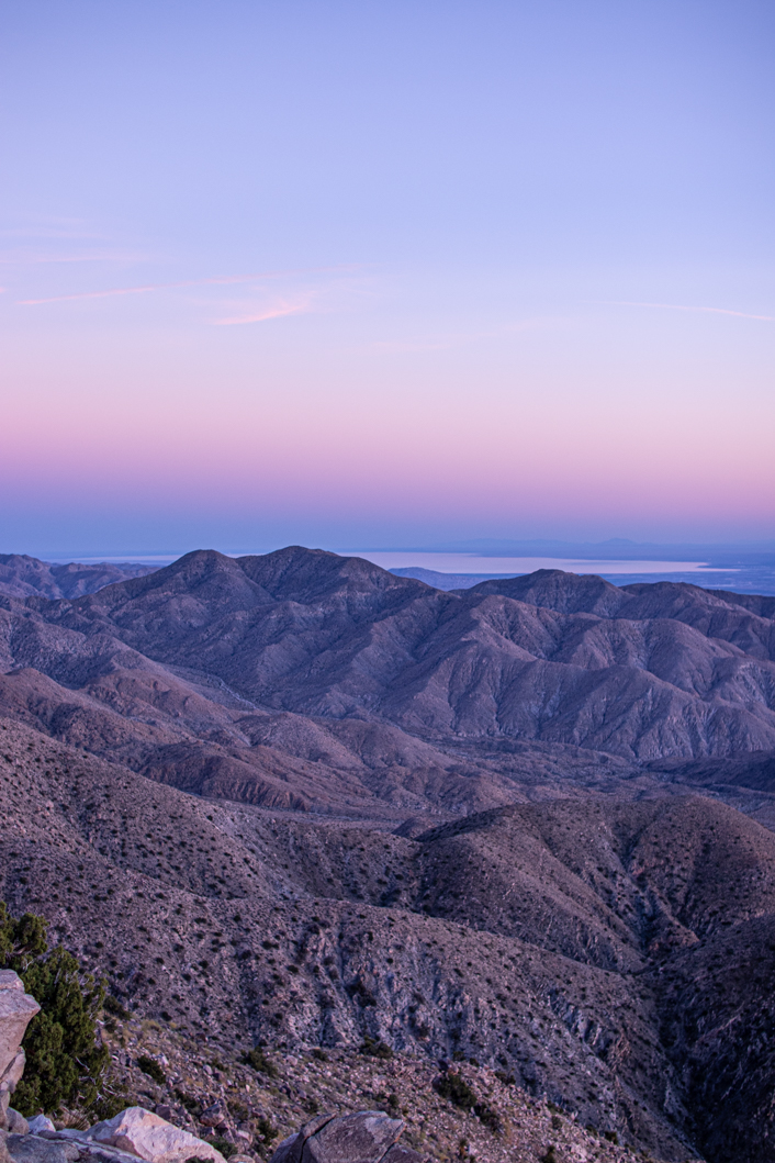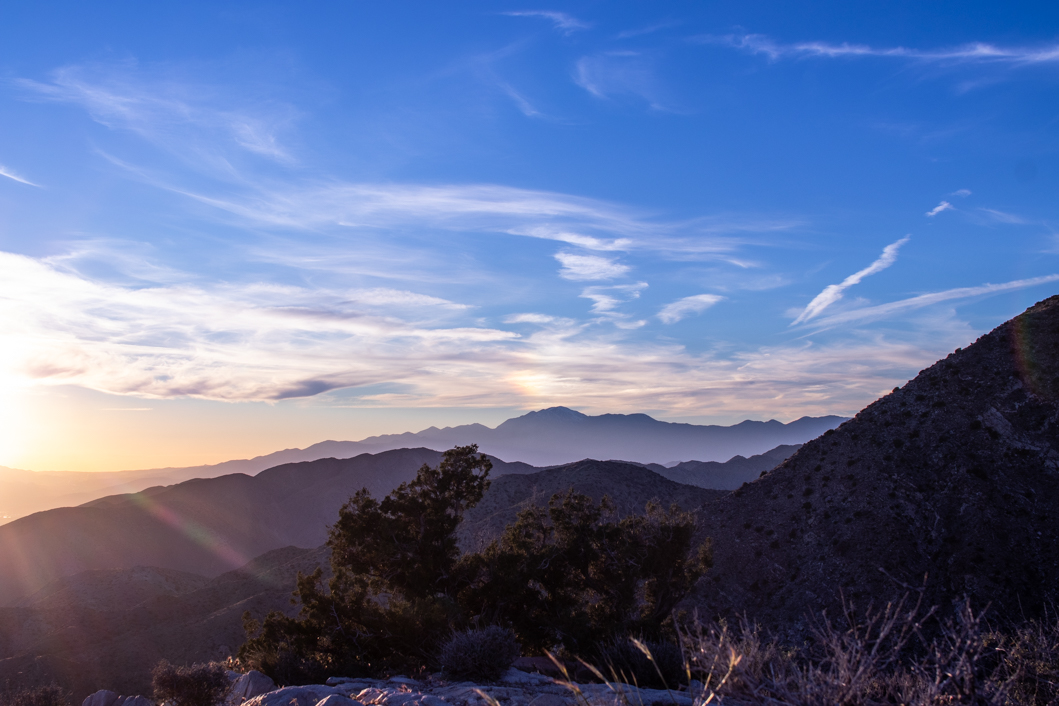 Der beste Platz für den Sonnenuntergang ist Keys View. Kurz bevor die Sonne untergeht ist fast kein Parkplatz mehr zu bekommen. Die Leute kommen in Scharen und schauen der Sonne zu, wie sie hinter den San Bernadino Mountains versinkt. Es ist windig und schnell sinken die Temperaturen. Aber es ist eben auch spektakulär. Hoch über dem Coachella Valley kann man den Salton Sea sehen und die San Andreas Verwerfung.