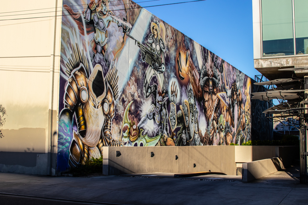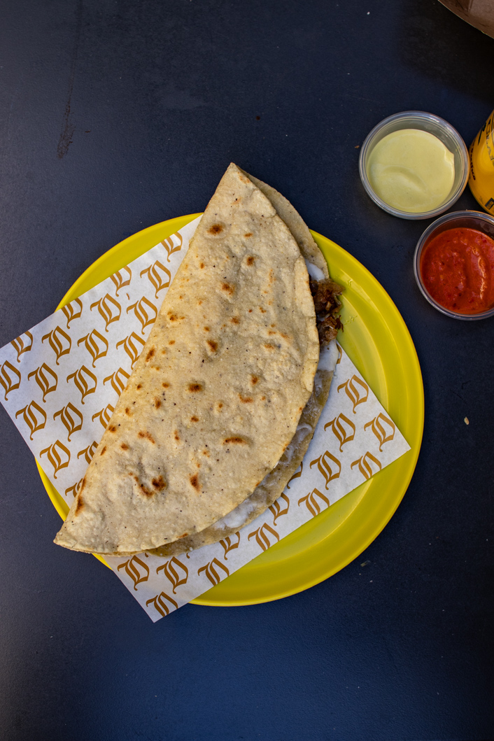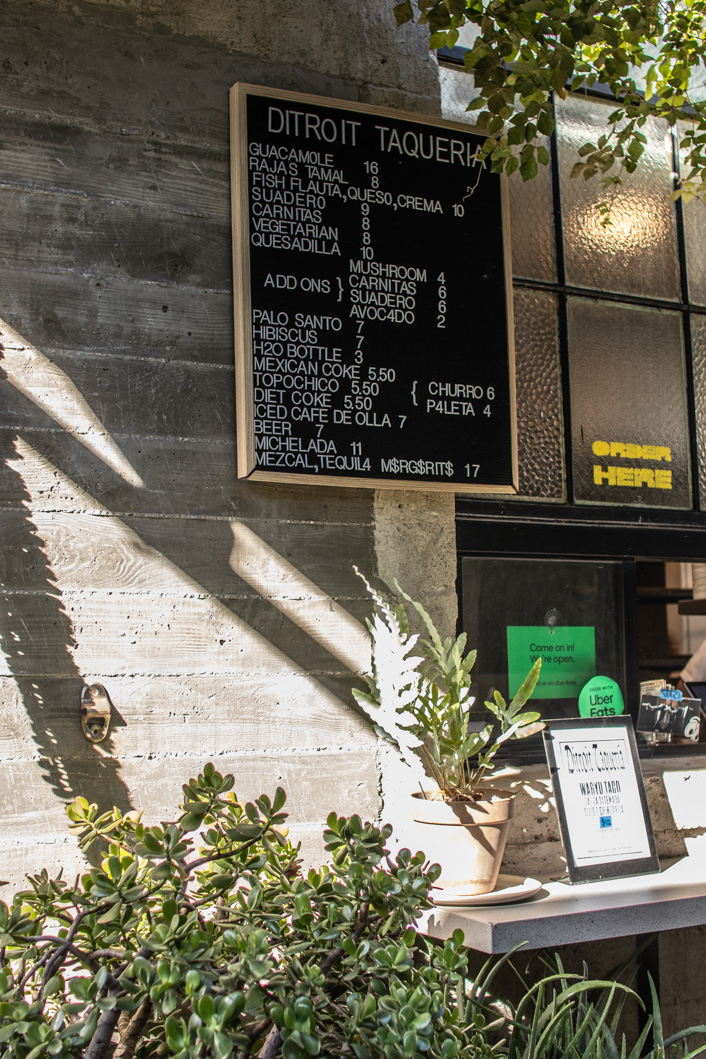 Der Arts District am östlichen Rand der Innenstadt von LA ist jetzt bestimmt nicht der grünste Stadtteil aber voller Überraschungen. Coole kleine Läden (wie zum Beispiel ein Laden nur mit Japanischen Schneidbrettern), Bars und einige der angesagtesten Restaurants (Damian, Baroo, Girl & the Goat, etc.) sind hier. Die wenigen Bäume an der Santa Fe Avenue sind voller lila Blüten und an jeder Ecke sieht mal kunstvolle Graffitis. Mein Plan, großartiges mexikanisches Essen zu erleben, scheint jedoch nicht so ganz aufzugehen. Damien, ein vielgelobtes Restaurant mit gehobener mexikanischer Küche, öffnet seine Türen erst um 17:00 Uhr. Zu diesem Zeitpunkt – für mich 2:00 Uhr in der Nacht – sendet mein Körper eben jene Signale, die eher Schlaf als Essen heißen. Das ist zuviel für den ersten Tag. Immerhin war ich schon früh am Morgen auf dem Markt. Aber das Schicksal hat ein Einsehen und das heißt Ditroit Taqueria und ist die „Tages-Dependance“ des Damian. Hier, in einem eher unscheinbaren Hinterhof, gibt es alles, was das Herz an Carnitas, Guacomole und Quesadillas begehrt. Und das Beste? Sie öffnet bereits um 11:00 Uhr. Und so besteht mein erstes „Dinner“ (um drei Uhr nachmittags) aus Guacomole und Quesadilla mit Carnita und einem mexikanischen Bier.