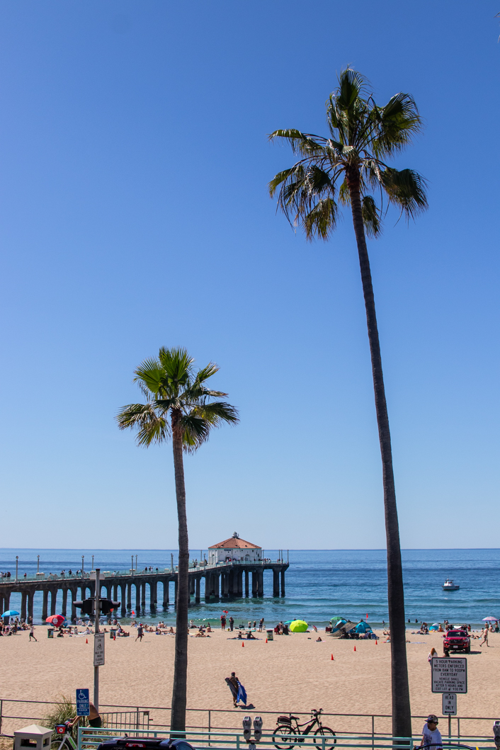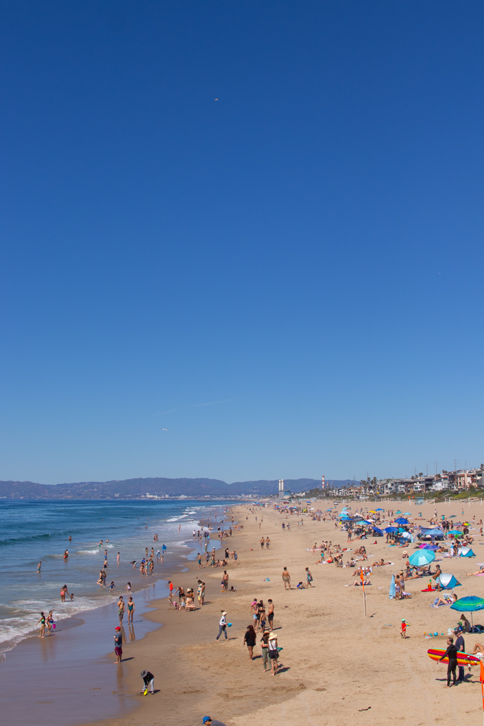 Böse Zungen meinen ja, wenn man sie auf das wirklich magische Blau des Himmels anspricht, das käme vom Smog und vielleicht ist das auch so, aber das Licht und die Farben am Meer sind etwas Besonderes. Und dieses Blau lässt sich immer am besten am Strand erleben. Der breite Manhattan Beach ist einer der beliebtesten Strände der Stadt. In einem Supermarkt entdecke ich Sonnenspray mit Lichtschutzfaktor 70, das muss ich natürlich haben. Und setze mich mit einem eiskalten Kokoswasser an den Beach. Hach, Kalifornien… das ist schon ziemlich großartig hier.