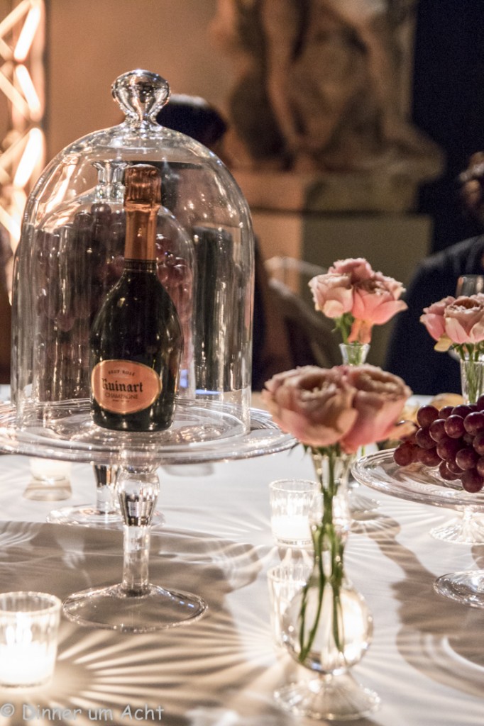 Doch, oh Freude, ich bin nicht die letzte. Bei einem ersten Gläschen der perlenden Köstlichkeit fällt alles was den Tag bisher bestimmte von mir ab. Ich befinde mich in reizender Gesellschaft. Geladen zu diesem Champagner Diner „en rose“ sind Damen der Münchner Medienwelt. Als wir kurz darauf in einen eigens für diesen Abend dekorierten Raum geleitet werden, ist ein einhelliges Ohh! zu vernehmen (früher hätte man zu diesem Anlass sicherlich den Fächer gezückt, heute ist es eben das Smartphone). Mitten im Raum mit der sicher zehn Meter hohen Decke ist eine wahrlich fürstliche Tafel angerichtet. Alles ist in Rosé getaucht. Noch mehr Kerzen. Noch mehr Trauben.