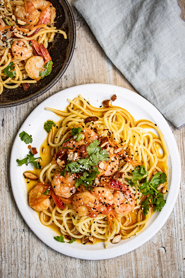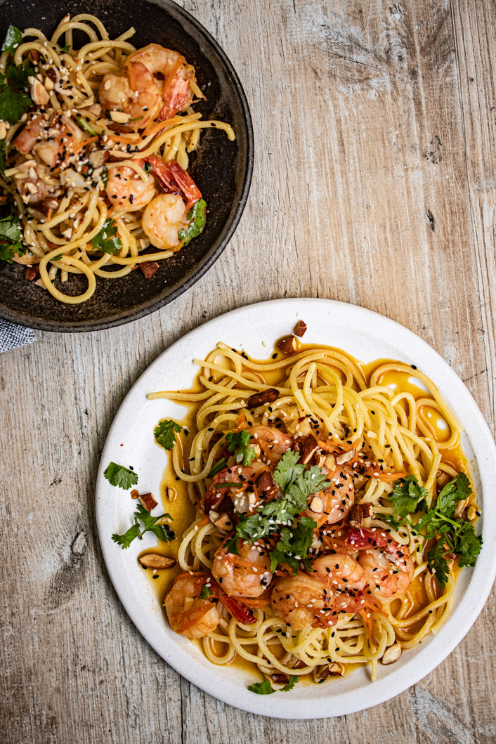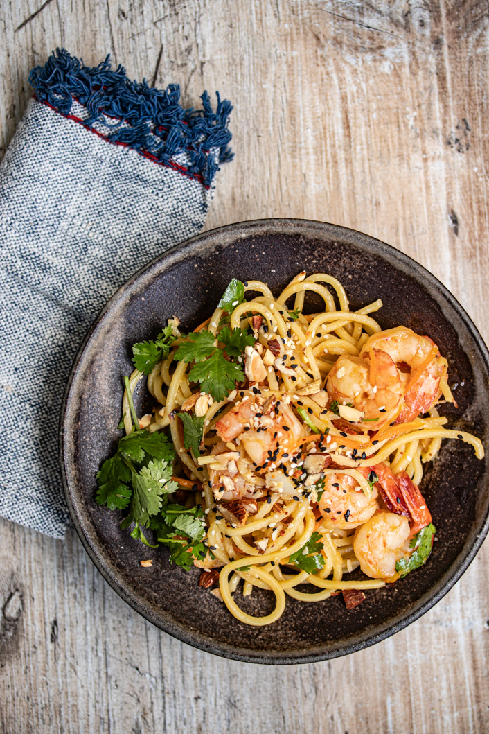 Eiernudeln mit Tamari-Butter, Garnelen und Rauchmandeln