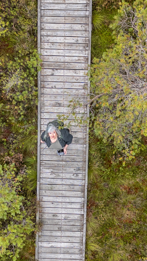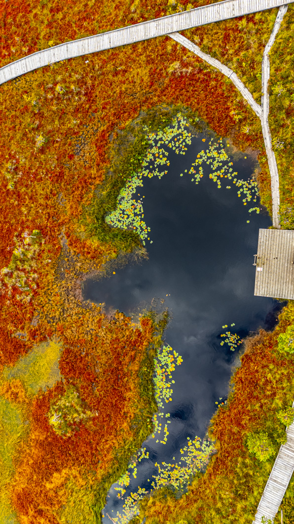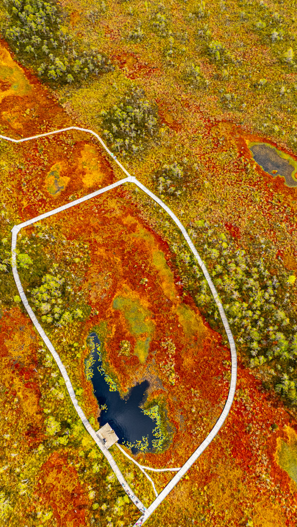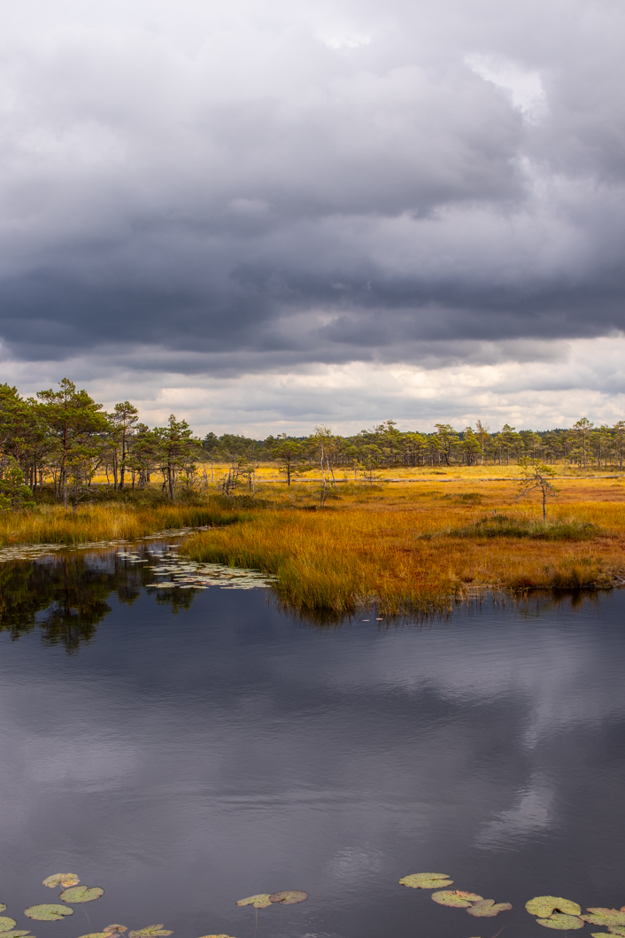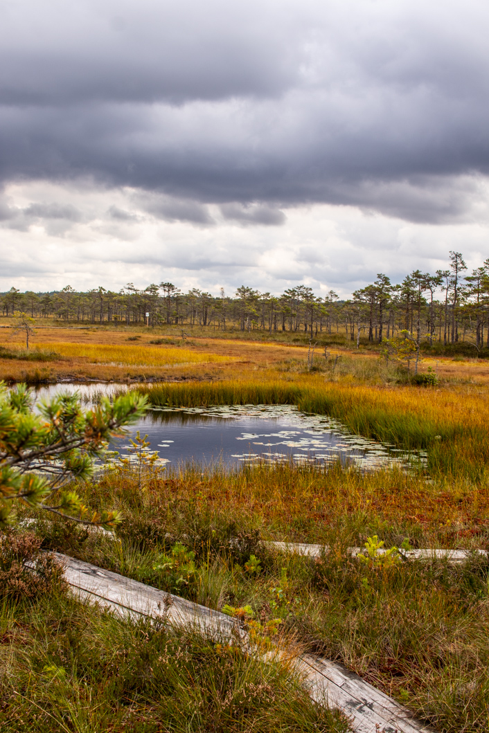Geschichten von Mooren haben immer etwas Gruseliges. Manchmal verschwinden Menschen auf Nimmerwiedersehen, manchmal sind es Geister oder mystische Wesen, die darin ihr Unwesen treiben. Ich kenne zumindest nicht eine fröhliche Geschichte, die in einem Moor spielt. Seit jeder sind die Moore von entscheidendem Wert für die Umwelt und den Menschen. Moore speichern sehr viel CO² und mit dem Torf, der seit tausenden von Jahren im Moor gestochen wird, wird geheizt und Blumen damit gedüngt. Weil man ja nicht einfach so in einem Moor herumspazieren kann, muss man sich entweder so etwas wie Schneeschuhe anziehen, damit man nicht einsinkt oder man bleibt auf den Holzpfaden. Meins sind definitiv die Holzpfade. Ich fahre an die Bushaltestelle Riisa raba, dort gibt es einen kleinen Parkplatz und direkt dahinter beginnt der Pfad ins Moor. Zuerst wandere ich nur durch Heidelandschaft, um ich herum stehen niedrige Nadelbäume. Überall blüht Heidekraut und je tiefer ich in die Moorlandschaft vordringe, desto farbenfroher wird es. Ich würde mir nicht anmaßen, die Pflanzen hier zu bestimmen, würde ich vielleicht von knallrotem Moos sprechen, erzürne ich ganz sicher den einen oder andere Botaniker unter meinen Lesern und laufe in Gefahr, mich hier heillos in Vermutungen und falschen Bezeichnungen zu verfangen. Und so beobachte nur still die winzigen Blüten, die fettig glänzenden kleinen Sumpfblumen und wäre da nicht diese Schulklasse, die just an diesem Tag ihrem Wanderausflug frönt, ich hätte mich vielleicht der Kleider entledigt und wäre in den Moorteich gehupft. Soll ja warm sein so ein Moor. Stattdessen sitze ich auf einer Bank und betrachte den Teich, lasse meine Gedanken fliegen. Die zuerst und dann die Drohne. Über mir nähert sich diese bedrohlich regenschwangere, dunkle Wolke und trotzdem ich wäre immer weitergelaufen. Letztendlich hat sie mich dann aber doch erwischt und ich war klatschnass. Die Momente zwischen Sonne, Wolken, dem Licht und dem Regen waren magisch.