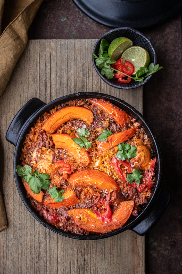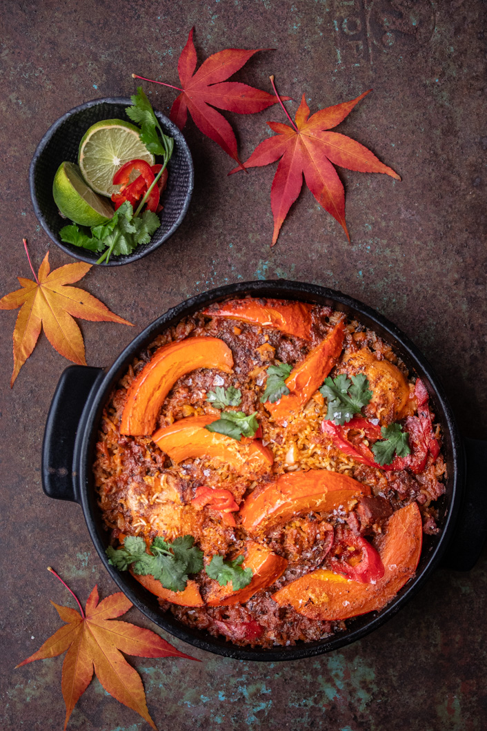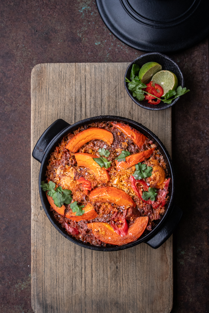 Huhn mit Kürbis, Chili, Chorizo und Reis