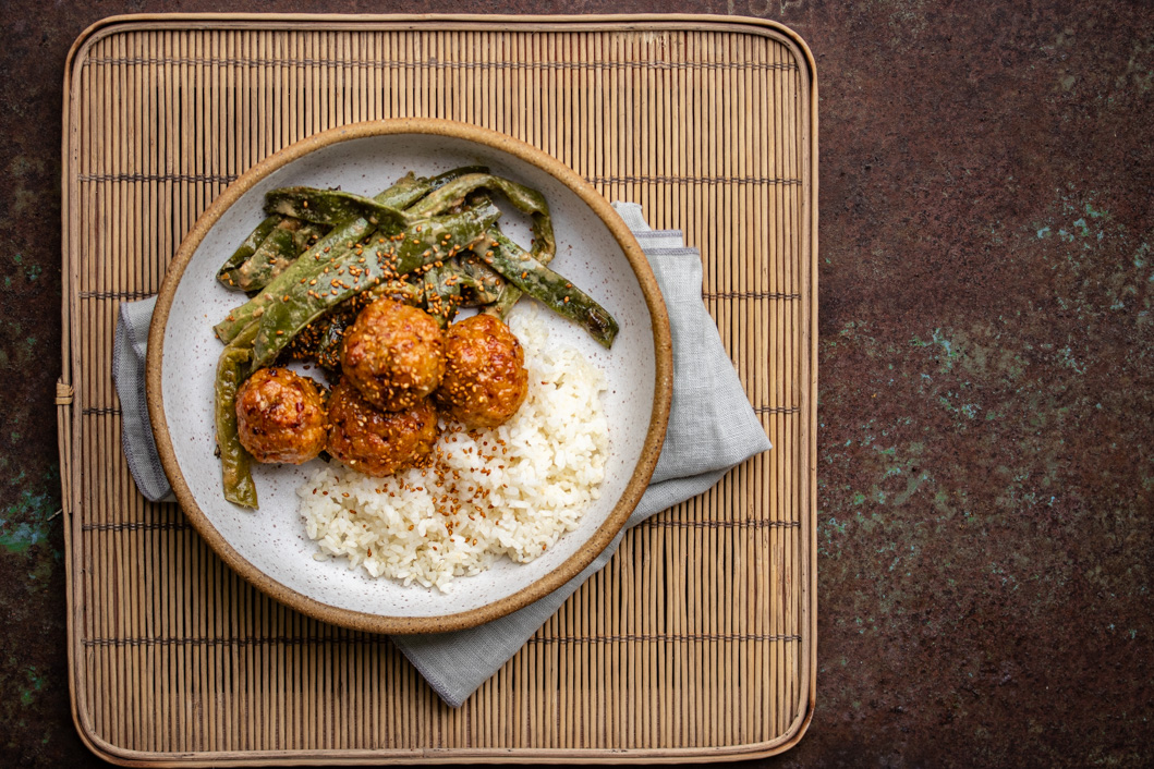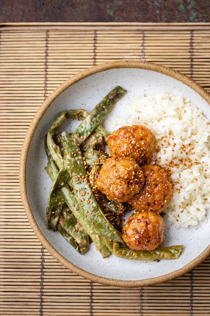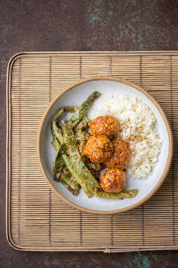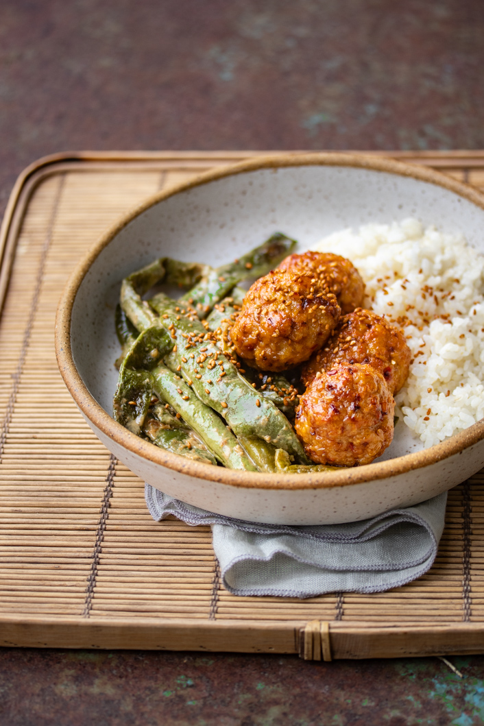 Hühnerbällchen mit Sesam-Bohnen aus dem Ofen