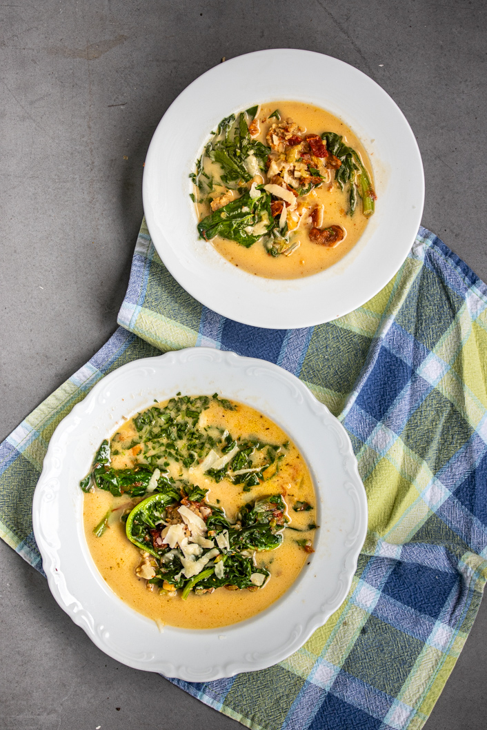 Dank der getrockneten Tomaten und dem geriebenen Käse, kommt hier auch noch einmal so ein wärmendes Italien-Feeling ins Spiel. Vor kurzem habe ich die „halbtrockenen“ Snack-Tomaten ausprobiert und bin ehrlich gesagt nicht besonders begeistert davon. Nur falls die jemand in Erwägung ziehen sollte, von wegen weniger Öl und so. Irgendwie fehlte denen das für getrocknete Tomaten so typische, intensive Aroma. Das konnten sie nicht liefern, also lieber die getrockneten Tomaten aus dem Glas, die in Öl schwimmen verwenden, denn das aromatische Öl kann man gut für die Dekoration der Suppe verwenden.