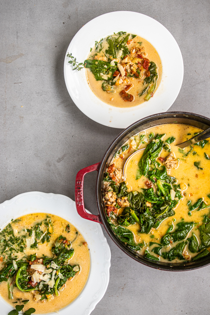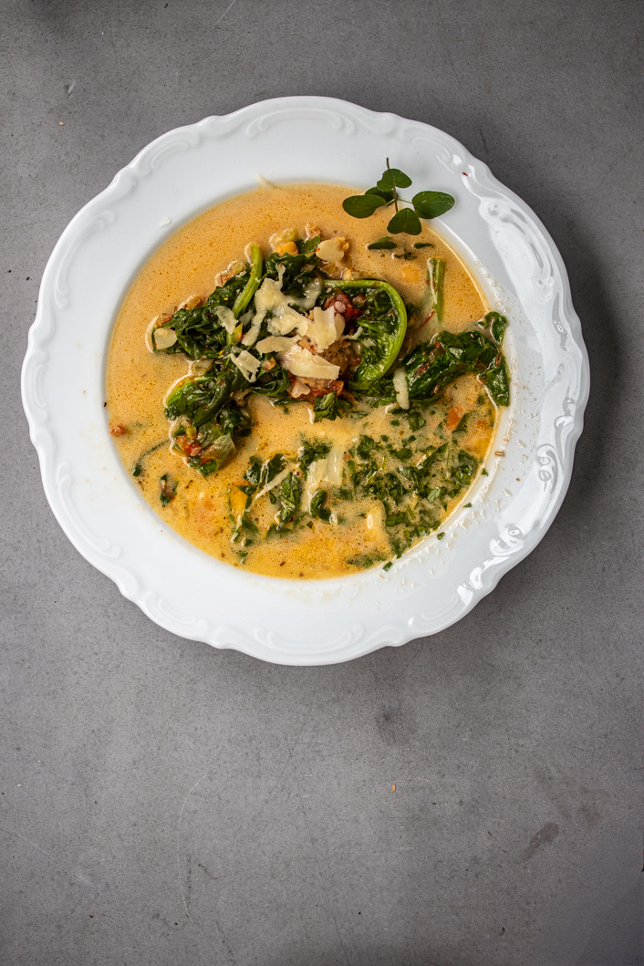 Kichererbsen-Parmesan Suppe mit getrockneten Tomaten, Mangold und Salsiccia