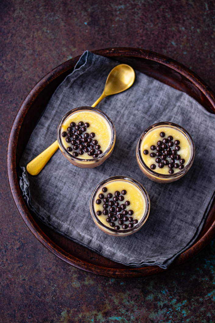 Den Curd auf die Mousse geben und nach Belieben mit Schokostreuseln dekorieren.