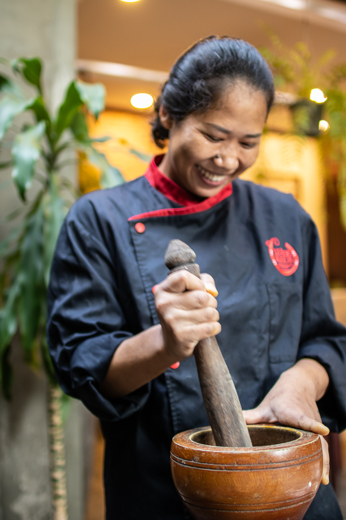 Trotzdem bin ich angenehm überrascht. Der Rindfleischsalat ist wunderbar würzig, der Wasserspinat aromatisch und knackig und ich verliebe mich ein wenig in Fish Amok. Die Milde des Curries schmeichelt dem Fisch. Die Aromen sind ausgewogen, nichts dominiert und ich fühle mich ein wenig umarmt von diesem Geschmack. Die meisten Tische an diesem Abend bleiben leer. Das dürfte sich bald wieder ändern, wenn mehr Touristen ins Land kommen.