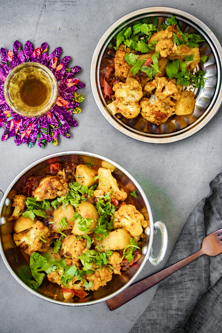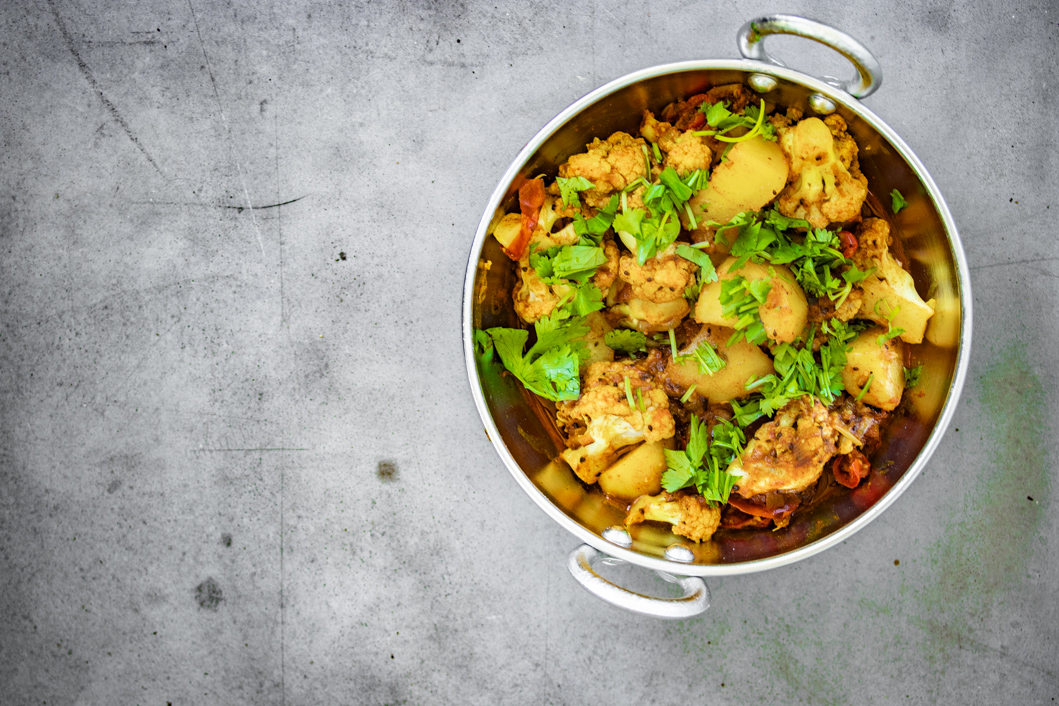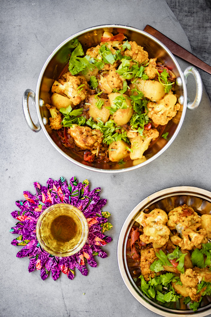 Überhaupt kann man bei Aloo Gobi (was auf Hindi/Urdu schlicht Blumenkohl und Kartoffeln heißt) nicht unbedingt von Tradition sprechen. Die Kartoffeln kamen mit den Portugiesen im 17. Jahrhundert nach Indien. Und erst mit den Briten wurden sie populär. Davor fristeten sie eher ein Schattendasein. Der Blumenkohl brauchte sogar noch ein bisschen länger. Erst so um 1822 brachten die Briten Samen davon nach Indien. Dann allerdings waren die beiden Gemüse nicht mehr aufzuhalten und sind heute feste Bestandteile der klassischen indischen „Sabzi“ (Gemüse ohne viel Sauce) Küche.