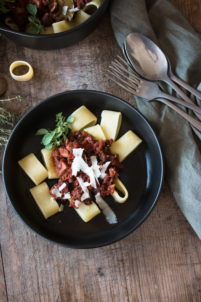 Die Nudeln dazu nach Packungsanweisung kochen und zusammen mit der Sugo und einigen Spänen Parmesan servieren. Wer will darf natürlich noch ein paar Blättchen frischen Oregano darauf dekorieren.